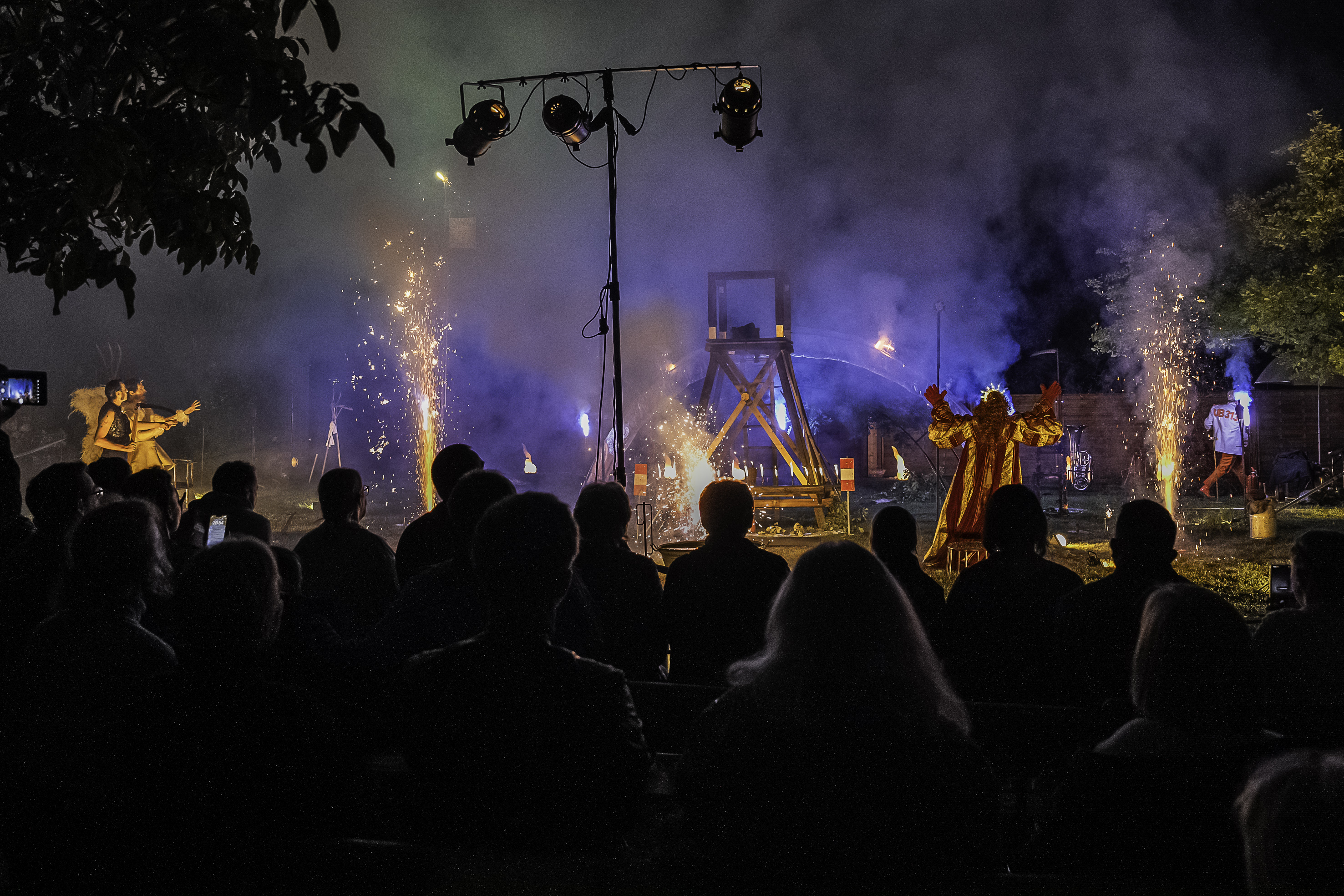 Im Schatten des Turms der niedergebrannten Wigbertkirche, eine der WirkungsstäHen Thomas Müntzers, befindet sich die historische Stadtmühle aus dem 17. Jahrhundert. Ihr stimmungsvoller Garten wird zur Bühne für vier Schauspieler und Feuerwerks-Künstler, die eine sehr spezielle, komödiantische Show zum geschichtlichen Gedenken darbringen, indem sie sich nicht nur als Protagonisten der Zeit des Bauernkriegs, sondern auch als Diskutanten höherer Sphären zur Verfügung stellen: Wir erleben einen tatsächlich beflügelten Engel Michael, der an der Seite des pragmatisch selbstgerechten Todes versucht, uns zu bewegen, alle schwerwiegenden Hoffnungen aufzugeben, um, wie damals zu Müntzers und Luthers Zeiten, die immer aktuelle Frage, wessen Geistes Kind die Menschheit zu werden gedenkt, klug zu beantworten. Und das angesichts eingreifender Erfindungen: zwischen Buchdruck, Banken und jenen, die bis weit in den Kosmos reichen. Wir erleben aber auch eine durchaus bezaubernde, selbstreferenMelle Abendsonne in charmant aufgebügeltem Theater-Kostüm, die in purer Lust überall zündelt, um schließlich selbst in heiße Liebe zu einem neuentdeckten Planeten UB313 zu entbrennen, der dann, der Feuer-Kunst mächtig, für uns alle die ungewöhnlichsten Ausdrucksformen dieser Kunst - von zart-lieblich, bis zu aggressiv- gefährlich - nicht nur prachtvoll darzubieten, sondern auch hochschweifend-üppig zu platzieren weiß!